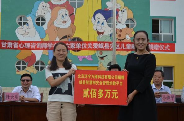 岷县副县长胡佳斌代表县委、县政府和岷县人民对甘肃省心理咨询师学会、北京环宇万维科技有限公司等六家单位表示感谢。他说:“7•22”地震给岷县及岷县人民造成了巨大的经济损失和心理创伤。几年来,全国各地掀起了“支援灾区人民、帮助灾后重建”的热潮,从资金、物资等方面对我县进行了大力支援,给岷县人民灾后重建带来了极大的信心。在各方面的共同努力下,全县经济社会快速发展,各级各类学校的办学条件也得到了进一步的改善,教育质量上了一个新台阶。目前,全县的幼儿园管理工作面临着从传统的粗放型管理到现代精细化管理的转变,这不仅需要观念理念的更新,更需要设施设备的支撑。今天捐赠的幼儿园安全管理设施,将为我们解决幼儿园安全管理方面的难题,对于全县幼儿园及全体幼儿园师生来说意义重大。