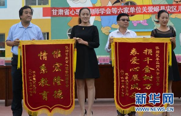 当天, 岷县教育体育局向甘肃省心理咨询师学会等六家爱心单位赠送锦旗。