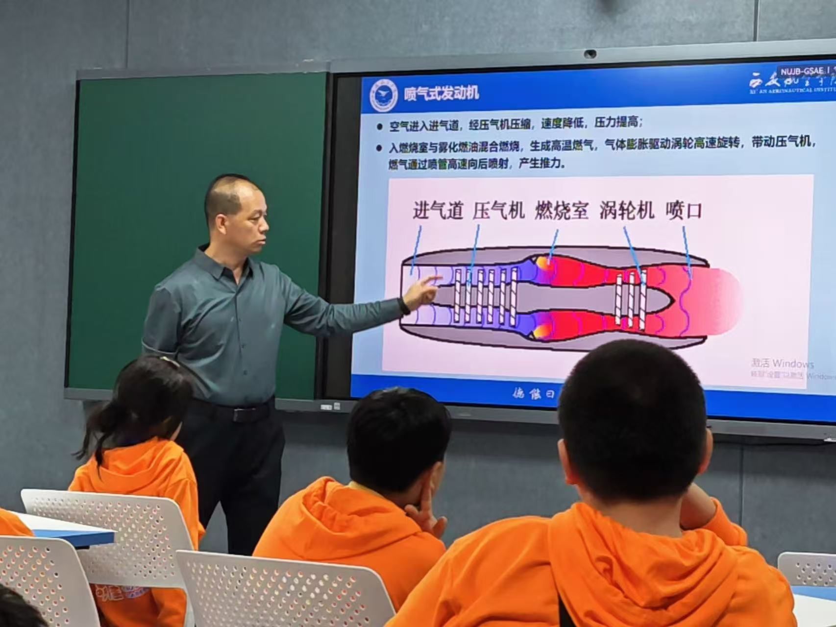在航空工程实验教学示范中心,孩子们近距离观摩了飞机与发动机实物,并通过飞行器学院党总支书记刘建强的讲座《神奇的飞行》了解了航空航天的基础知识和喷气式发动机原理等。