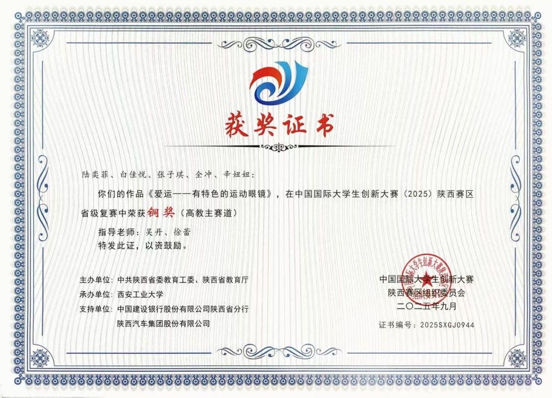 近日,2025年全国大学生创新大赛陕西省赛区评选结果公布。经过人文与外国语学院选拔、学校初赛、省赛网评、金奖争夺赛、冠军争夺赛的激烈角逐,秘书学专业2023级学生陆奕菲负责的项目“爱运--有特色的运动眼镜”荣获陕西省铜奖。