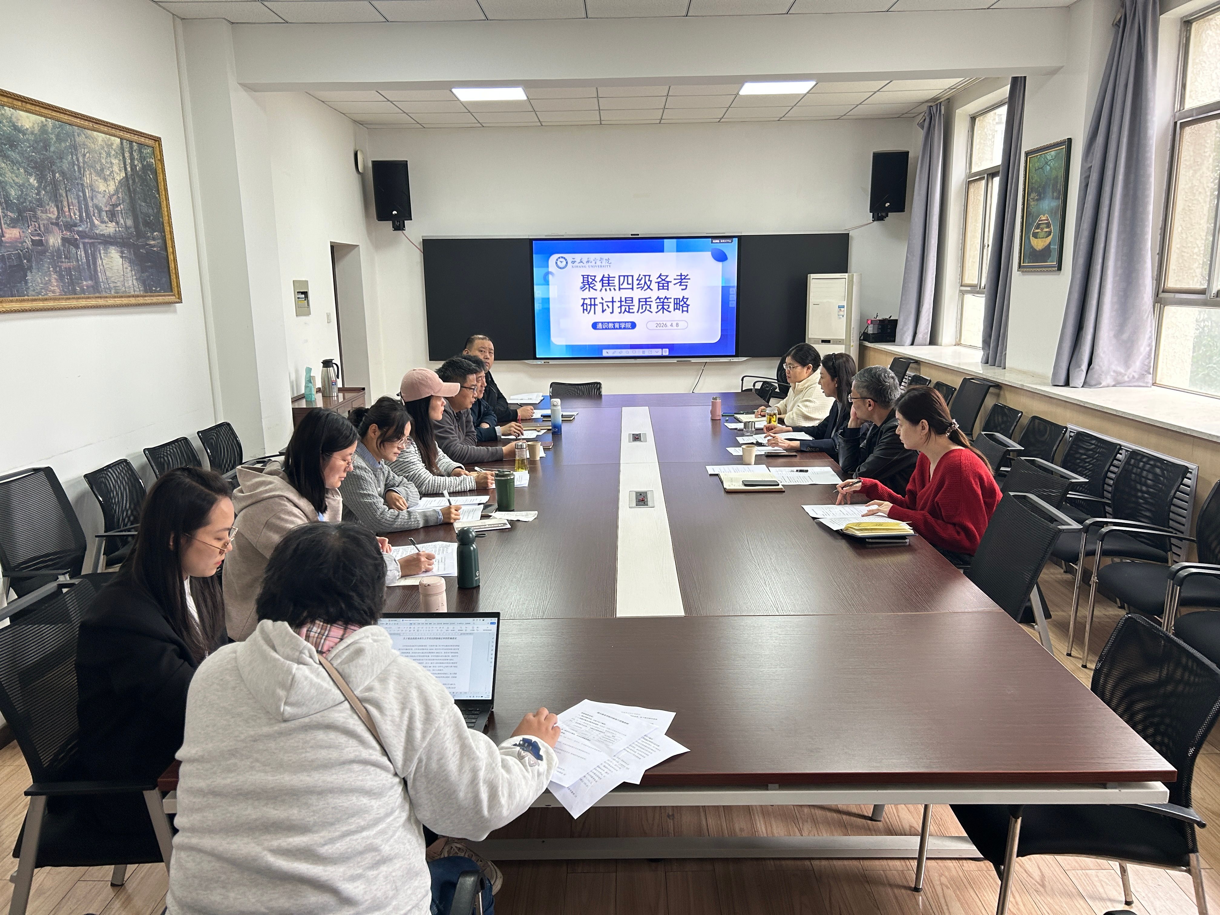 与会人员围绕课堂教学优化、学生激励机制等方面展开深入研讨,明确了提升举措,一是优化课堂教学体系。调整教学内容与课时安排,增加四级教学比重;完善过程性评价标准,做好平时考核与四级备考的衔接。二是强化教学与备考联动。将四级题型融入日常教学与作业设计,实现四级备考贯穿大学英语教学全过程。三是完善免修与绩点管理政策。优化免修政策,提高免修绩点认定标准,引导学生主动提升英语能力;建立绩点置换机制,为通过四级考试的学生提供绩点提升通道,强化正向激励。
